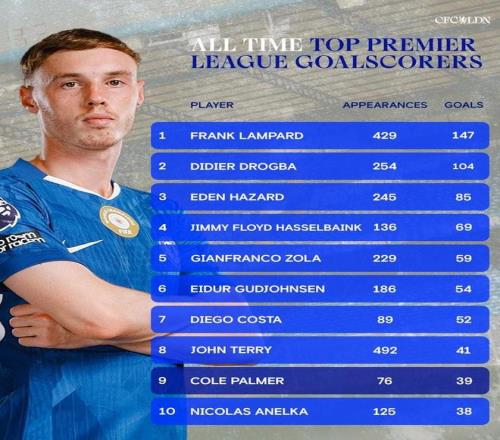 根据统计,到目前为止,帕尔默已经代表切尔西在英超中打进39粒进球,超越阿内尔卡,独占队史英超射手榜第9名。