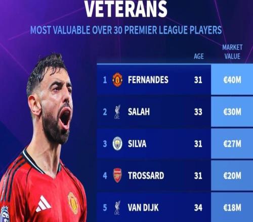 北京时间12月14日,在更新了英超球员的身价之后,德转还列出了英超30岁以上球员的身价榜,布鲁诺-费尔南德斯以4000万欧元的身价排名第一,萨拉赫3000万欧元排名第二,伯纳多-席尔瓦27