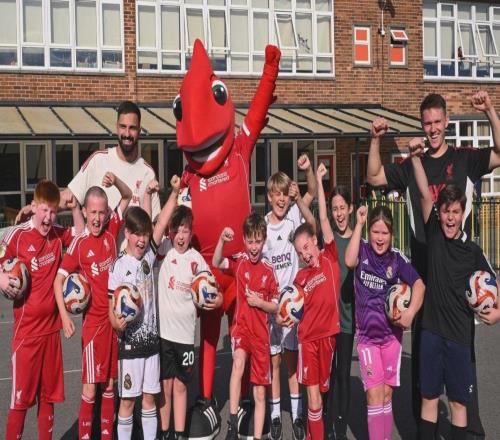 雷速体育10月10日报道宣称 近日,利物浦球队的两名守门员马马尔达什维利和伍德曼与俱乐部吉祥物Mighty Red一同参与了柯比圣劳伦斯小学参加课后足球活动的孩子们的训练。该活